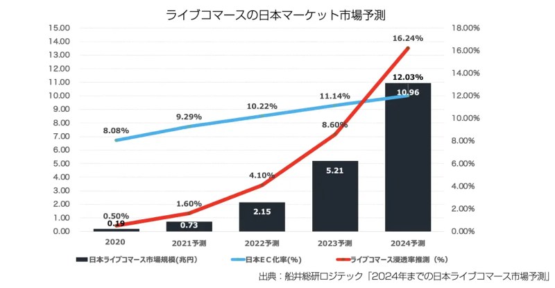 ライブ配信市場は日々成長しており、日本で2024年には10兆円規模の市場になると言われ、5G・Wi-Fi6が普及することで動画視聴に適した通信環境に変化し、ライブコマースを導入する企業も増えてきました。今後もメタバースの普及などでライブコマースは今後もさらに普及すると考えられています。